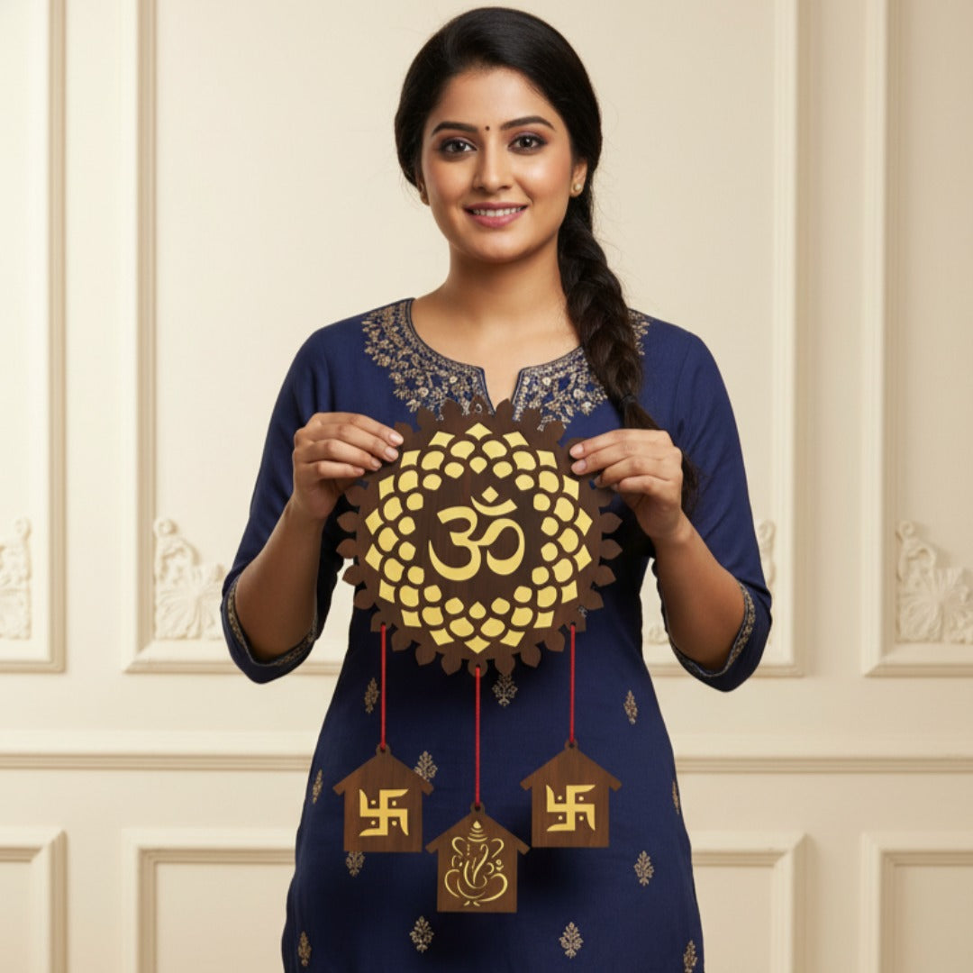 Wooden Om Wall Hanging with Swastik and Ganesh